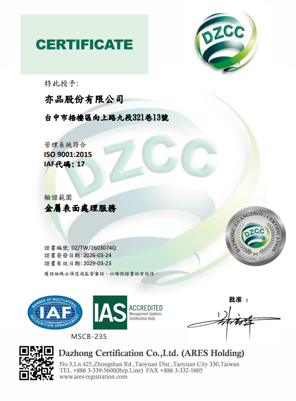 亦品股份有限公司位於台中港關聯工業園區 ,專注金屬表面處理與染黑加工,